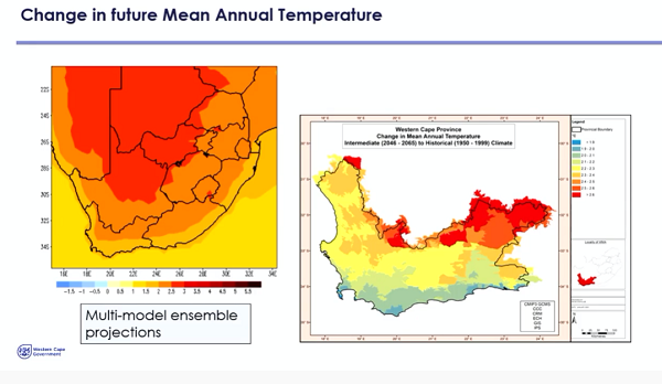 “Rainfall projection is much more difficult than temperature. The globe as a whole is going to get wetter but certain areas in the subtropics and all of the Mediterranean will get drier, in fruit production areas like Chile, California, Mediterranean Europe and the Western Cape. Droughts will become more frequent, by the mid-century probably 2.5 times more likely.”