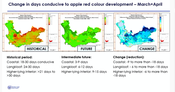 By mid-century there will be a reduction in the number of days conducive to red colour development on apples, with a reduction of between 9 and 18 days and in a coastal area like Elgin-Grabouw, that could be limited to between 3 and 9 days such days over March and April in future.
