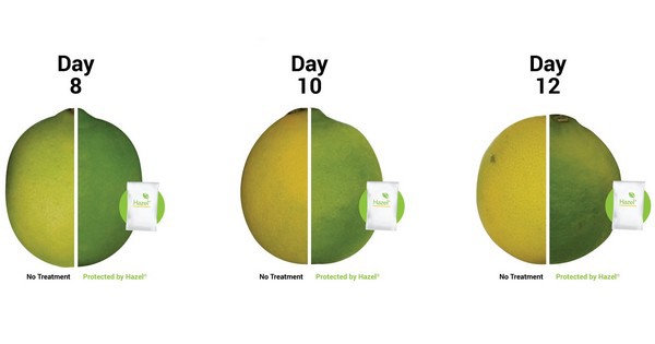 During a 20-day trial in 2021, Hazel Tech’s postharvest team compared the overall skin color found in 10 boxes of Hazel 100-treated limes and 10 boxes of untreated limes. On days four through 20 of the trial, results showed the sachets reduced yellowing in the lime’s exterior across the board. On the final day of the trial, 30 percent of the Hazel 100-treated limes had greener skin than the control.