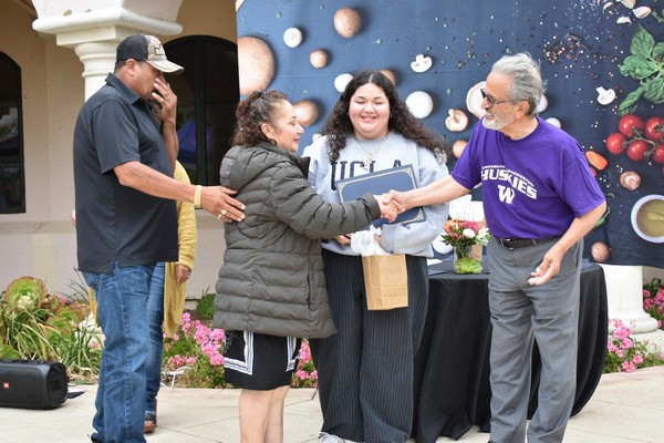 Shah Kazemi, Monterey Mushrooms CEO, congratulates the mother of the scholarship award recipient, Antonia Guerrero Sanchez, alongside her husband and Monterey Mushrooms teammate, Hector Sanchez, in Watsonville, California.