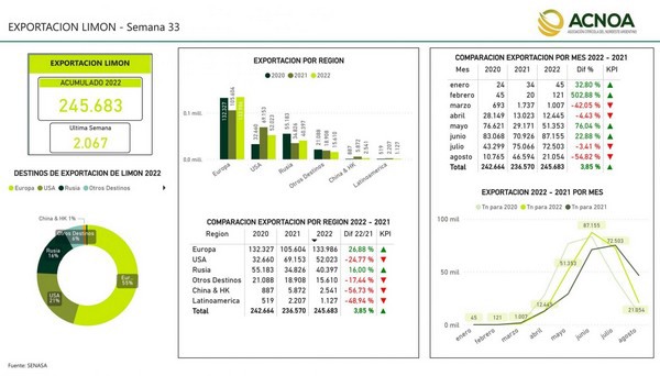 The information is based on the latest statistics up to week 33 of the Citrus Growers Association of the Argentine Northwest (Acnoa), based in Tucuman. After positive export flows during the months of May and June, July -3.41% and especially August -54.82% up to date had bigger decreases in volumes compared to the same months last year.