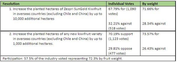 A total of 67.8% of growers and 71.7% by fruit weight voted in favour of the first proposal to increase the number of hectares. 70.2% by producer vote count and 73.6 % by fruit weight count supported a second resolution to allow the planting of up to 1,000 additional hectares of new varieties. 75% is required on both counts for a producer vote to pass under the Kiwifruit Export Regulations.
