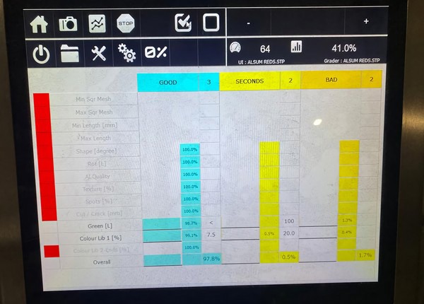 The system uses an integrated suite of cameras, lighting, and software to size and grade bell peppers for color, size, weight and even shape defects, all using AI to implement operator-set grading choices. It transmits live images of every bell pepper passing through the sorter, across all lanes, to operators, allowing them to adjust on the fly or see the effects of adjustments they are considering.