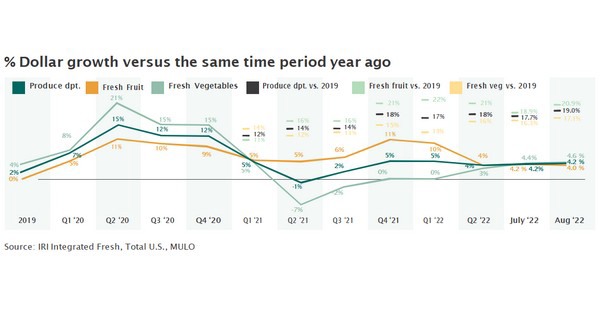 “In the fourth quarter of 2021 and the first quarter of 2022, fruit grew much faster than vegetables,” explained Parker. “In July, fruit and vegetables came in at +4 percent dollar growth, each. In August, vegetable growth moved ahead of fruit once more.”