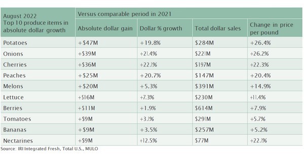 In August, fresh fruit added $119 million in sales and vegetables added $120 million when compared to August 2021. Potatoes, onions, cherries, peaches and nectarines each had inflation of 20 percent or more compared with the average price per pound in August 2021. Berries, tomatoes and bananas had inflation below the rate for total food and beverages and demand remained strong.