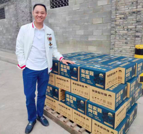 Mr. Lu Wuqiang and a stack of environment-friendly boxes