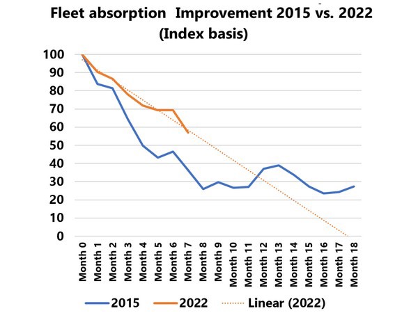 The third way, as shown in the figure above, is to normalize the developments in 2015 and 2022 down to the same baseline and create an absorption index equalling 100 points at the respective peaks. In this case, we can see that in relative terms, the pace of improvement in 2022 is less than in 2015, but the indication is also that the current situation will come down to meet the 2015 developments by January 2023. In summary, all three models suggest we should be back at the “normal” 2% capacity loss baseline by early 2023, assuming the current pace continues, and there any no new major supply chain disruptions.