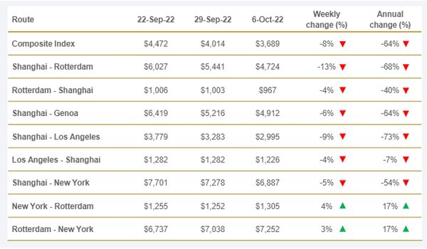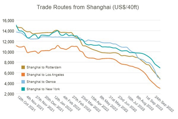 As the Europe-US trade lanes have logged annual gains of 17% in spot rates, rates on China-US, China-Europe stretches have fallen anywhere between 55-75%. The Shanghai-Los Angeles (USWC) trade lane fell below US$3,000, a feat after 26 months, given the demand weakness and the Chinese golden week.