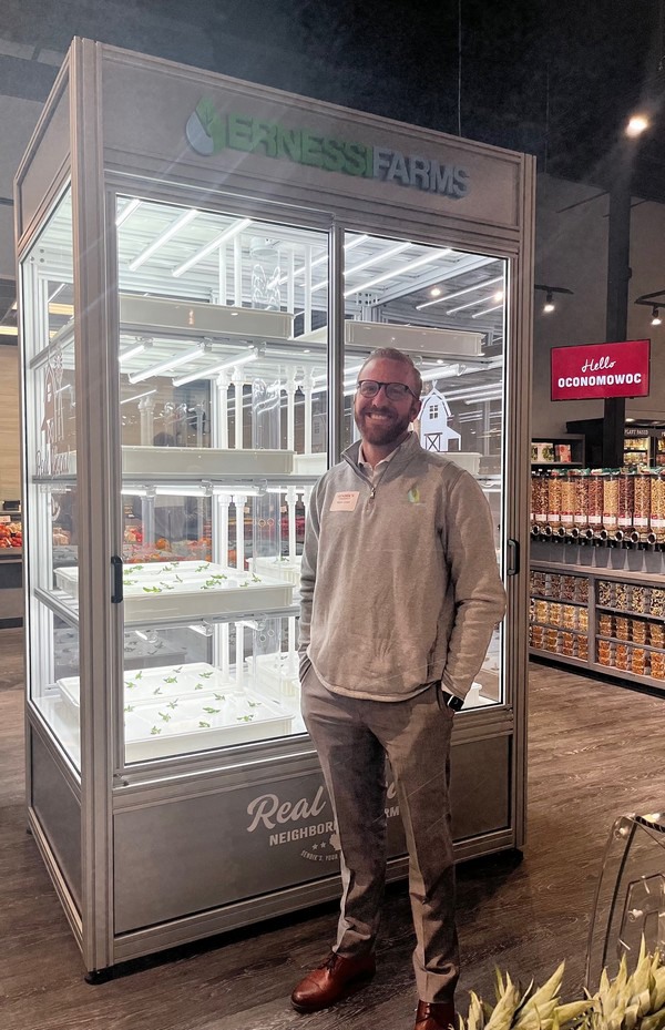 Ernessi Farms has partnered with Sendik’s Food Market to create a small indoor farm in their new Oconomowoc Pabst Farm location. This Stand Alone Growing Enclosure (SAGE) Farm will grow two different lettuce varieties, thus reducing harvest time to the consumer to less than 10 seconds.