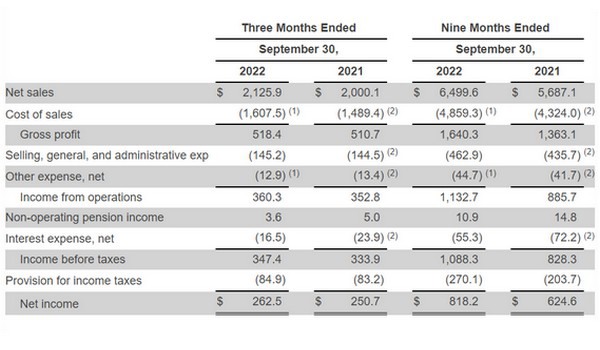 Packaging Corporation of America has reported a third quarter 2022 net income of $262 million, or $2.80 per share, and net income of $266 million, or $2.83 per share, excluding special items. Third quarter net sales were $2.1 billion in 2022 and $2.0 billion in 2021.