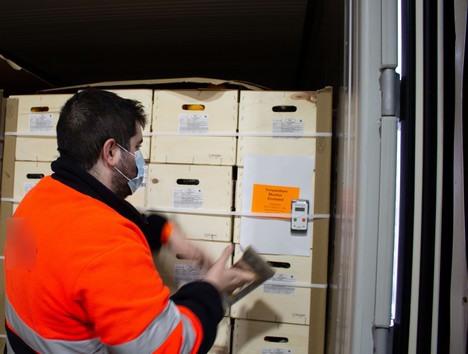 Ryan® type temperature recorder in the container (the device on top of the orange adhesive attached to the pallet), which is not used to guarantee cold treatment but to measure the ambient temperature of the container.