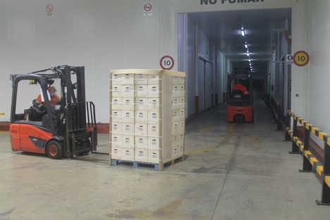 A load of pre-cooled-at-treatment-temperature Spanish oranges is transported to the containers approved for cold treatment.