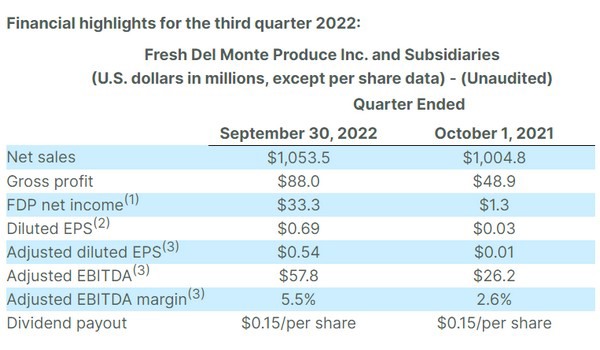 Fresh Del Monte Produce Inc. today reported financial results for the third quarter ended September 30, 2022.