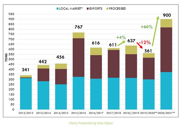Although production over the past few years has fluctuated, the 2020/2021 season saw a sharp 60% increase in production compared to the previous season. Meaning that 900 tons of cherries were produced in 2020/2021, 300 tons more than in 2019/2020.