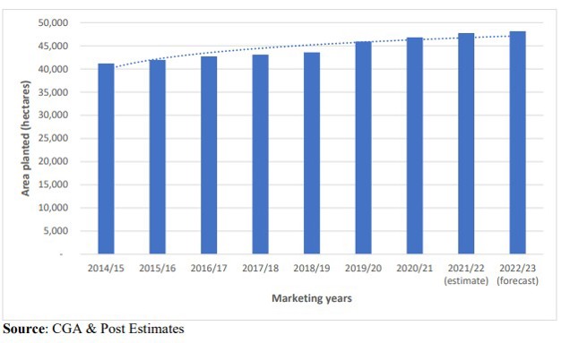 The area under citrus cultivation in South Africa has grown steadily over the past decade, driven by ongoing investments on relatively high earnings from export markets. As a result, South Africa is set for record citrus exports of 2.7 million tons in marketing year 2021/22. However, the expansion in citrus orchards is expected to ease in marketing year 2022/23. Accelerating farming input costs, higher shipping rates, new phytosanitary regulations imposed by the European Union, inflationary pressures on consumers in key markets, and infrastructure inefficiencies are challenging South Africa’s citrus exports. These factors are reducing the profitability of the sector, resulting in restrained investment in the industry.