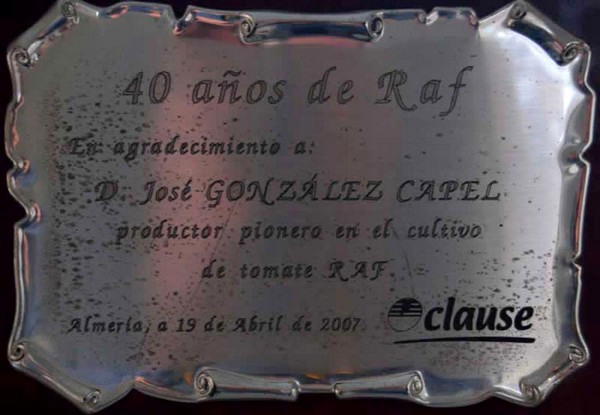 "One of those seeds was planted in my father's greenhouse. My father, Pepe Gonzalez, is now 97 years old and still takes care of the El Alquián farm where, 50 years later, he continues to grow Raf tomatoes." In April 2007, on the 40th anniversary of the Raf tomato, Clause presented a commemorative plaque to the four pioneers of cultivation in Almería, including Pepe.