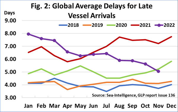 Global schedule reliability improved by 4.7 percentage points M/M in November 2022 and reached 56.6%. The average delay for LATE vessel arrivals has also been improving consistently since the start of 2022. In November 2022, average delay improved once again, dropping by another -0.58 days M/M to 5.04 days. Both schedule reliability and average delay are now better than the 2020 level as well.