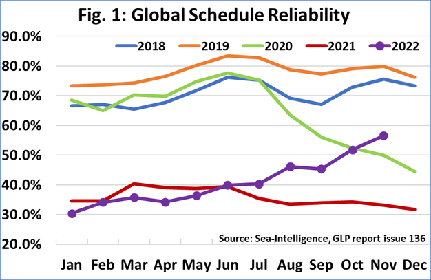 Sea-Intelligence has published issue 136 of the Global Liner Performance (GLP) report, with schedule reliability figures up to and including November 2022. As the report itself is quite comprehensive and covers schedule reliability across 34 different trade lanes and 60+ carriers.