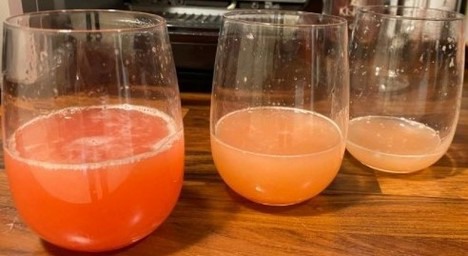 Left glass is juice of the Red Premium, the other glasses from other grapefruits
