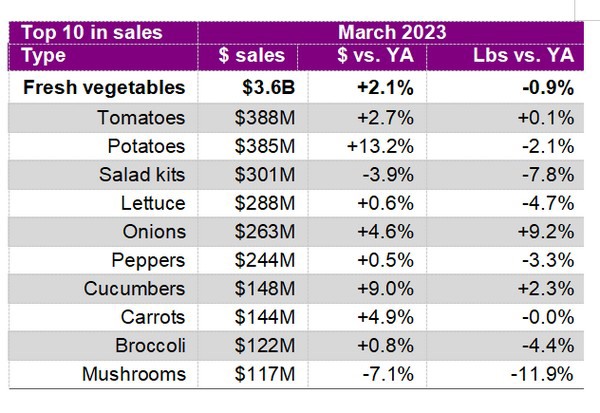 In March 2023, fresh vegetables added $74.6 million in additional dollars versus March 2022 whereas total fruit lost $84.3 million in sales.