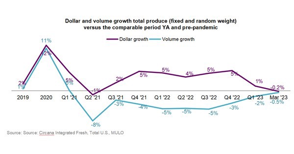 The more favorable retail prices for fruit resulted in steady volume sales when compared to March 2022. Volume demand for vegetables continued to trend below year-ago levels but moved within 1 percentage point.