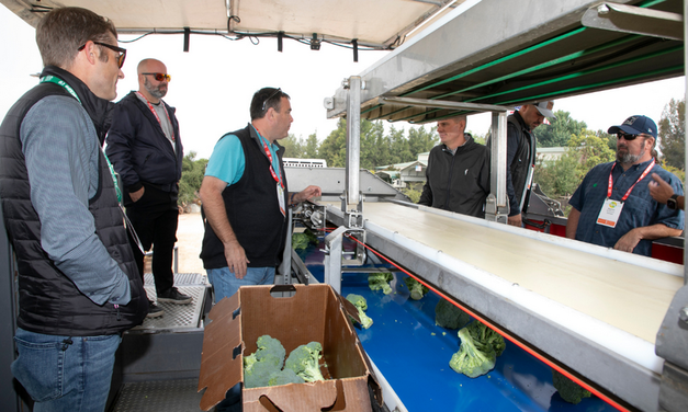 Retailer attendees learning about automatic broccoli harvest at field tour.