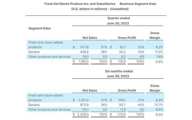 Gross profit for the second quarter of 2023 was $116.8 million compared with $80.7 million in the prior-year period, an increase of 45%. Gross profit benefited from lower product and distribution costs in the fresh and value-added products segment combined with higher banana profitability.