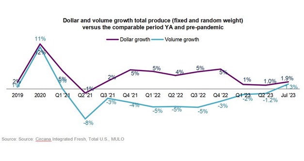 The investment in price on the fruit side paid off in large volume gains of 1.7 percent over July 2022. Vegetables also experienced pound growth but at a more moderate rate of 0.8 percent.