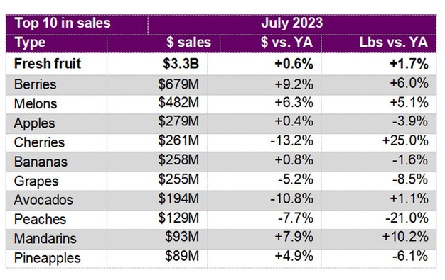 “Berries’ July performance was outstanding,” said Joe Watson, IFPA’s VP of retail, foodservice and wholesale. “The four July weeks generated $679 million in berries with substantial dollar and pound gains. Cherries continued to trend in the top five with $261 million in sales, which was down in dollars, but up in pounds.”