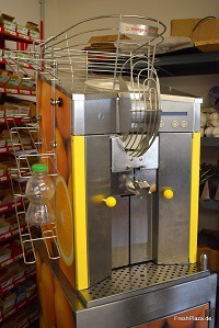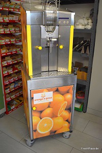 Among other things, the machine can be supplemented with a bottle holder, but also with a bracket at the outlet where bottles can be hung, allowing the machine to be individually foiled on the outside (see right). "We have developed a legally protected pressing principle in which the skins are not pressed along, which also means that no essential oils, bitter substances or potential treatment substances can escape. This means that not only organic oranges but also conventional produce can be used, which is a huge part for year-round supply. This also gives us a huge sales advantage. The bottle holder can be attached without taking up much space. A new addition is the anti-fruit fly system, which we have developed in cooperation with Hepro. There is air circulation in the machine, which prevents fruit flies from entering the press housing," says Große-Rohde.