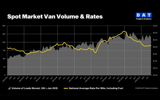 “Seasonality took hold in September,” said Ken Adamo, DAT Chief of Analytics. “Retailers had not yet replenished inventory ahead of the holidays, produce season was winding down and construction shipments slowed. At the same time, there were no disruptive events to push freight to the spot market. Hurricane season has been mild, and our data showed the United Auto Workers strike had little impact on freight movements in September.”