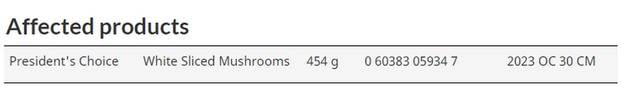 President's Choice brand White Sliced Mushrooms have been recalled due to Listeria monocytogenes. Buyers of this product are advised not to consume, use, sell, serve or distribute the recalled products.