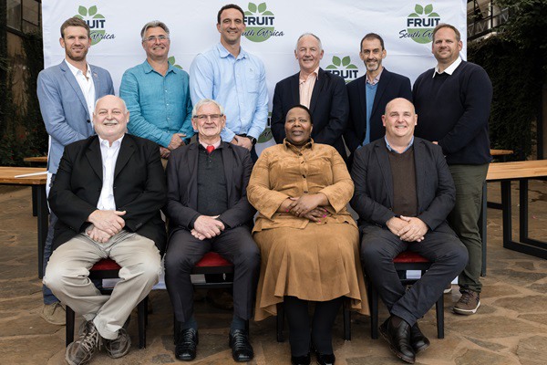 The board of FruitSA, at back: Theo Boshoff of Agbiz, Mark Jensen FPEF chair), AJ Griessel (SATI), Justin Chadwick (CGA), Derek Donkin (Subtrop) and Anton Viljoen (SATI). Front: Anton Rabe (Hortgro), Anton Kruger (FruitSA), Vangile Titi (FruitSA) and Nicholas Dicey (Hortgro) Photo: Frame Quest Media
