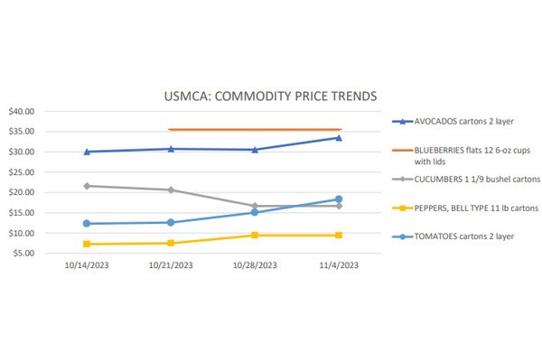 Movement of avocado 2023 crop crossings from Mexico through Texas is expected about the same. Trading 60s and 84s fairly slow, others moderate. Prices 40-48s slightly lower, 60-84s lower. Cartons 2-layer Hass 36s mostly 52.25-55.25, 40s mostly 43.25-44.25, 48s mostly 38.25-39.25, 60s mostly 25.25-27.25, 70s mostly 17.25-18.25 and 84s mostly 15.25- 17.25. Extra services included.