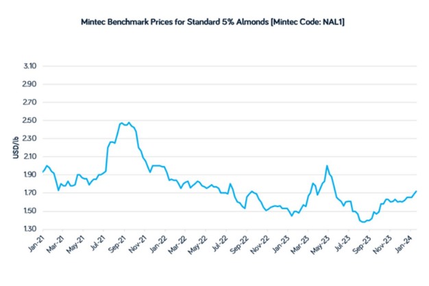 In the first assessment since the report, the Mintec Benchmark Prices for standard 5% almonds FAS US rose to $1.72/lb on 18 January, the highest value for the benchmark since May 2023. [Mintec Code: NAL1]