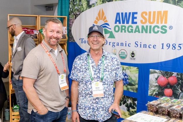 Buyer from Safeway Nor Cal visiting the Awe Sum Organics booth at OPS 2023. Photo: Organic Produce Summit.