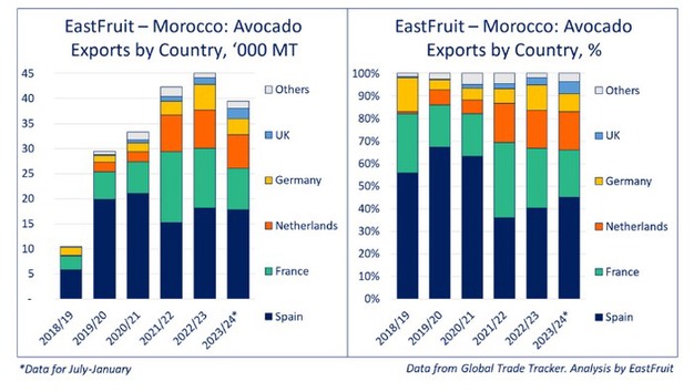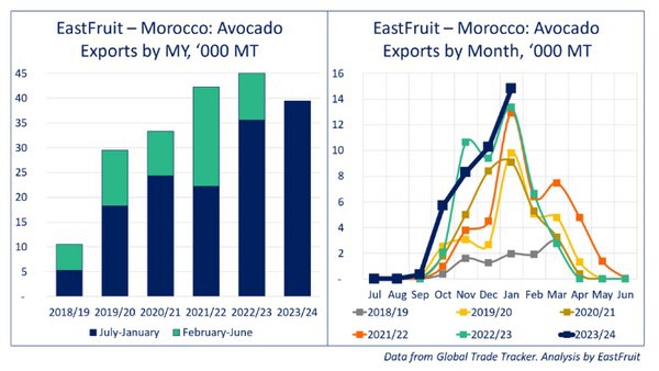 Between July 2023 and January 2024, Morocco achieved a milestone by exporting nearly 40,000 tons of avocados, valued at $120 million, setting a new record for the period. With four more months to go – since June typically sees a lull in exports – even if the figures for February to May 2024 dip to the lowest levels seen in recent years, the total export tally for the 2023/24 season is expected to be unprecedented. Preliminary data from the Moroccan Avocado Association corroborates this, suggesting that exports could indeed top 60,000 tons for the entire season.