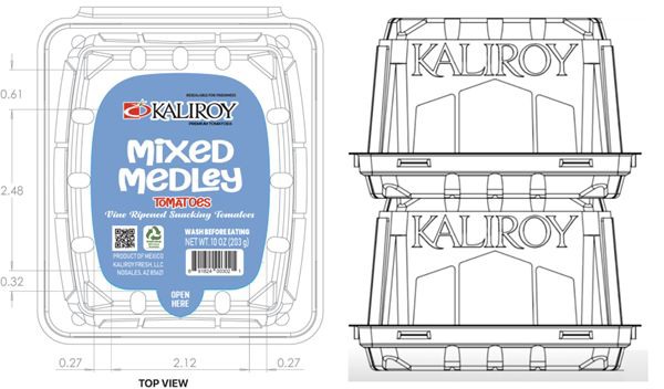 At Viva Fresh in Houston, Texas, April 11 – 13, 2024, Kaliroy Fresh LLC will launch a new, exclusive peel-back shaker snacking tomato clamshell made from recycled PET. The clamshell's design was inspired by the architecture of a greenhouse structure and attendees can visit booth #1110 to see the product in person.