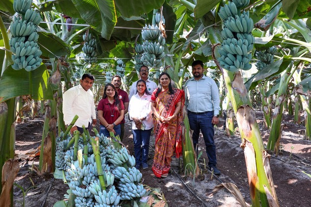 Rise n' Shine Biotech Private Limited, have developed Blue Java – an exotic variant of Tissue cultured banana plants which has a distinct taste and colour. Being made available for the first time in India on a commercial basis, the first harvest of this variant was done on 2nd April 2024 on the farm of Abhijeet Patil. Dr. Bhagyashree P. Patil, Founder & CMD, Rise n' Shine Biotech Private Limited and the farm Operation Manager of Rise n' Shine Amey Patil, Technical Manager Anil Kadam and the Banana Marketing team who were providing the technical guidance, were present at the first harvest on the farm.