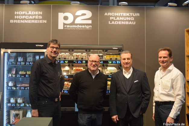 Peter Michels (second from right) together with the co-operation partners of P2Raumdesign at this year's Fruchtwelt Bodensee in Friedrichshafen. According to Michels, the core system with the refrigerator is the most popular, followed by Vieler Shelf, the solution with the aforementioned display case.