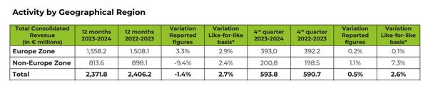 The Europe Zone, representing 65.7% of the business activity over the fiscal year, posted a growth over this period of +3.3% on reported figures and +2.9% on a like-for-like basis*, and of +0.2% and +0.1% respectively in Quarter 4.