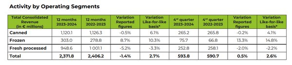 For the 2023-2024 fiscal year ended June 30, 2024, the Bonduelle Group revenue stands at 2,371.8 million euros, an increase of +2.7% on a like-for-like basis*. After taking account of exchange rate variations, it shows a decline of -1.4% on reported figures.