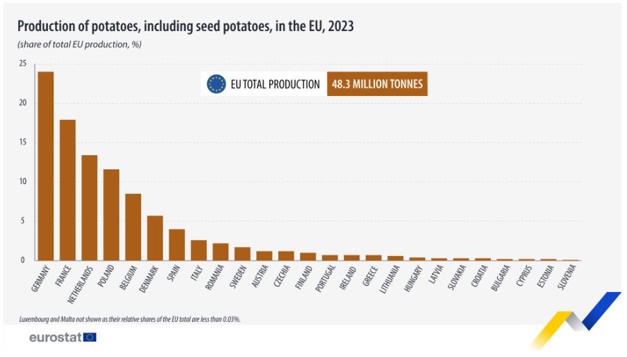 In 2023, 48.3 million tonnes of potatoes were harvested in the EU, a slight increase compared with 2022 when 47.5 million tonnes were harvested.