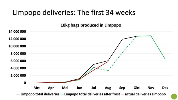 For Limpopo, the reduction by frost represents 13% of their average annual crop of 56 million 10kg bags of potatoes. "What happens in Limpopo between September to December plays a large role in what happens in the country. When Limpopo delivers to the markets they have a market share of around 80%."
