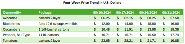 Blueberry movement from Washington and Oregon is expected to continue to decrease seasonally as the season should come to an end withing the next week. Trading is moderate at higher prices. Flats 12 6-oz cups with lids medium-large are mostly 16.00-18.00, flats 12 1-pint cups with lids medium-large are mostly 24.00-26.00; organic flats 6-oz cups with lids medium-large are mostly 22.00-24.00, 12 1-pint cups are mostly 34.00- 36.00. Quality is variable. Movement from Michigan is expected to continue to decrease as the season comes to an end. Current offerings are in too few hands to establish a market. Movement from British Columbia Canada crossings through Northwest Washington is expected to decrease with the season coming to an end this week. The shortage of berries meeting Canada One quality continues, and offerings are light on the the fresh market. Trading is moderate with prices higher on light supplies. Canada One flats 12 6-oz cups with lids medium-large are mostly 16.00-18.00, flats 12 1-pint cups with lids medium-large are mostly 24.00-26.00. Movement on Peru blueberries is expected to increase as more fruit arrives in the country, and reporting should begin soon.