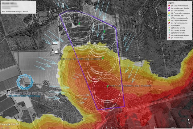 AGI Frost Fans follows a risk assessment model that considers the topography, as well as biomass data through satellite imagery and cold flow analyses.