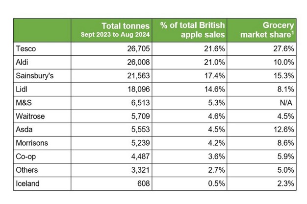 In the year starting September 2023, Tesco sold 26,705 tonnes of British dessert apples, only just ahead of Aldi that sold 26,008 and had topped the chart last year. Behind the two at the top came Sainsbury's that sold 21,563 tonnes and Lidl that sold 18,096 tonnes.