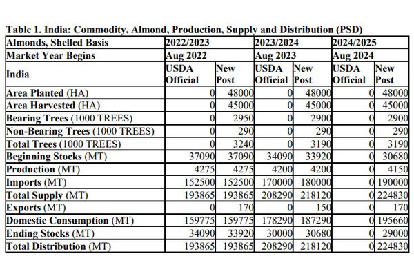 For marketing year (MY) 2024/2025 (August-July), post forecasts India's almond production marginally lower at 4,150 metric tons (MT) (shelled basis), compared to last MY estimates. For the same MY, post projects almond imports at 190,000 MT, up by six percent from the previous MY 2023/2024 estimates of 180,000 MT. Post is revising its earlier MY 2023/2024 import estimates to 180,000 MT based on the latest updated trade data. For MY 2024/2025 (September-August), post forecasts India's walnut production at 33,200 MT (in-shell basis). For MY 2023/2024, post is revising its estimates lower at 33,000 MT as there were no seasonal rains in the state of Jammu and Kashmir, and soil degradation in the walnut regions has affected its production yield. For MY 2024/2025, post expects India's walnut imports to reach 70,000 MT, a 17 percent increase from the previous MY estimates. India's MY 2024/2025 (September – August) pistachio (in-shell basis) imports are forecast at 40,000 MT.