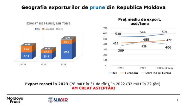 In May, vice-premier Dumitru Alaiba said that, in 2023/24, Moldova exported almost 60,000 tons of plums to the European Union, four times the quota valid until the summer of 2022. According to Moldova Fruct figures, 22% was destined for Romania, 16% for Poland, 10% for Germany, and eight percent for the Czech Republic. The remainder was distributed to the remaining E.U. countries.