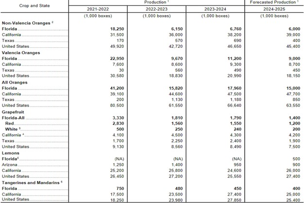 This past Friday, the U.S. Department of Agriculture (USDA) issued today its initial citrus crop forecast for the 2024-2025 harvest season. The USDA's current estimate does not reflect the damage inflicted by Hurricane Milton across central and south Florida earlier last week. The federal agency forecasts production to be 15 million boxes of oranges this season. Additionally, the USDA estimated 1.4 million boxes of grapefruit and 200,000 boxes of tangerines and tangelos.